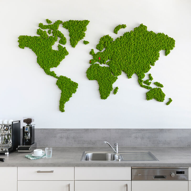 Diese exklusive Kombination aus hochwertigem Islandmoos und einer stilisierten Weltkarte wird nicht nur zum Eyecatcher in deinem Raum, sondern schafft auch eine erfrischende, natürliche Atmosphäre.