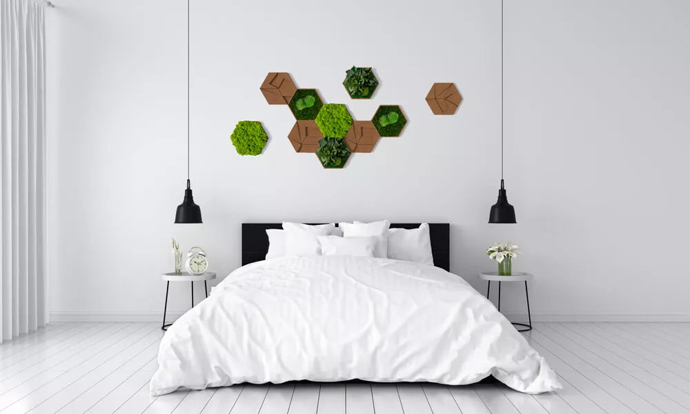 Die unbegrünten Hexagone aus Naturkork dienen als neutrale Basis, während die verschiedenen Moos- und Pflanzen-Hexagone eine frische und lebendige Note hinzufügen. Dank ihrer hochwertigen Verarbeitung und natürlichen Materialien sind diese Hexagone nicht nur eine Dekoration, sondern ein Statement für Umweltbewusstsein und ästhetischen Geschmack. Bringe die Natur in dein Zuhause oder Büro, ohne auf Stil zu verzichten.